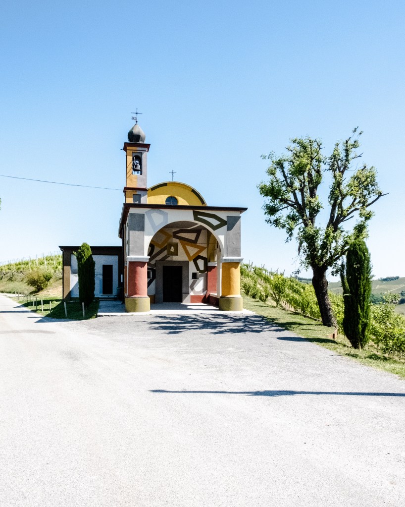 Tremlett si è occupato della ristrutturazione utilizzando la tecnica Wall Drawing, la stessa utilizzata per la Capella del Barolo.  La cappella si affaccia sulle colline del Moscato e la vista arriva fino al Monviso. Anche quì la vista è pazzesca! Si trova un pò fuori dai luoghi più famosi delle Langhe ma secondo me vale assolutamente andare a visitarla.